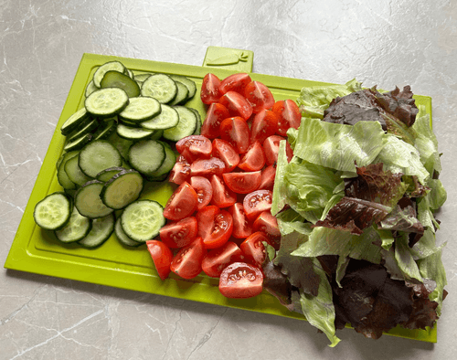 Slice cucumbers, tomatoes, and lettuce leaves.