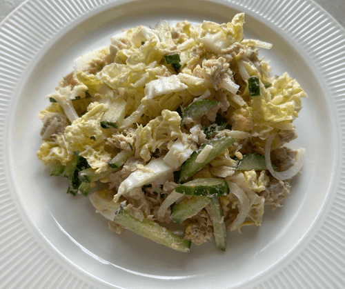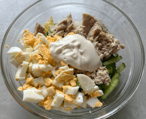 Tuna salad is a light and sophisticated dish of European cuisine that combines the freshness of vegetables with the rich flavor of tuna. This salad, inspired by Mediterranean traditions, has a delicate texture thanks to napa cabbage and the softness of boiled eggs, while hard cheese adds a piquant touch. Crunchy cucumbers and onions provide freshness, and mayonnaise brings the ingredients together in a harmonious ensemble. Historically, tuna salads emerged as a convenient and nutritious dish, perfect for a quick snack or light dinner. It can be served as a standalone dish or used as a side for main courses. Such a salad pairs wonderfully with white wine or fresh baguettes, making the meal even more refined.