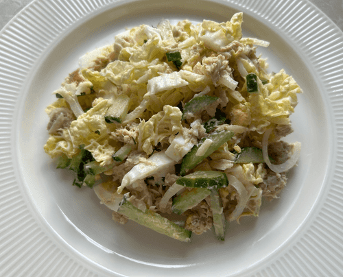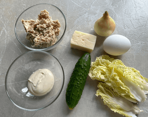 Put cucumber, egg, tuna, cheese, Beijing cabbage, onion, and mayonnaise in a bowl.