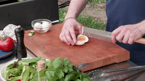 Boil the eggs hard, peel them, and cut in half.
