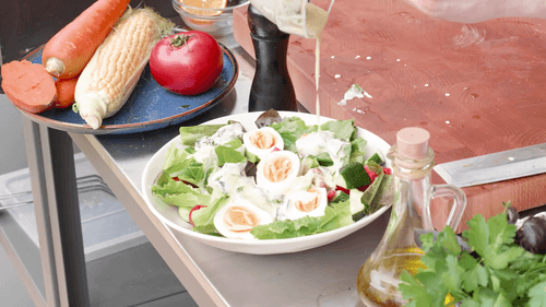 Add eggs to the salad and drizzle with sauce.