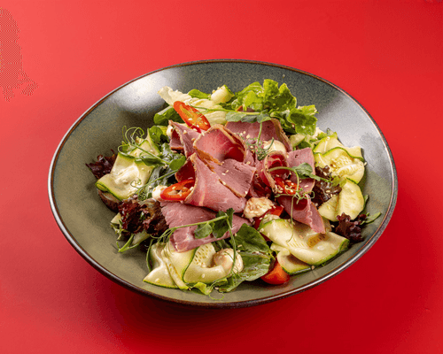 Salad with roast beef, mushrooms and zucchini