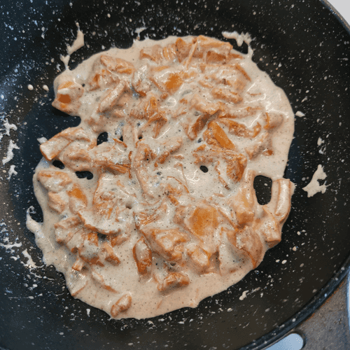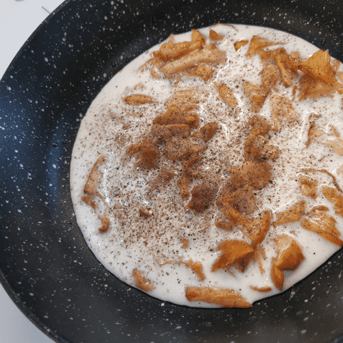 After 4 minutes, stir, reduce the heat, and pour in the cream. Add pepper.