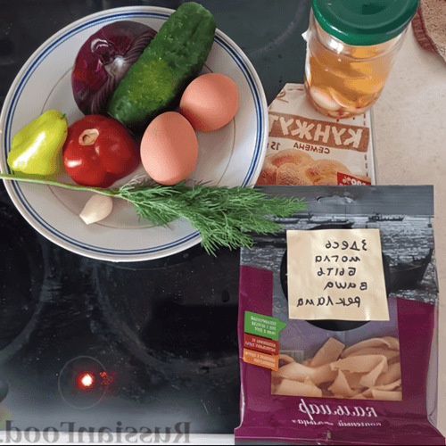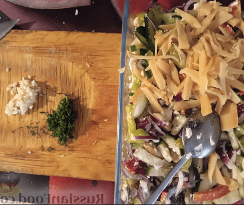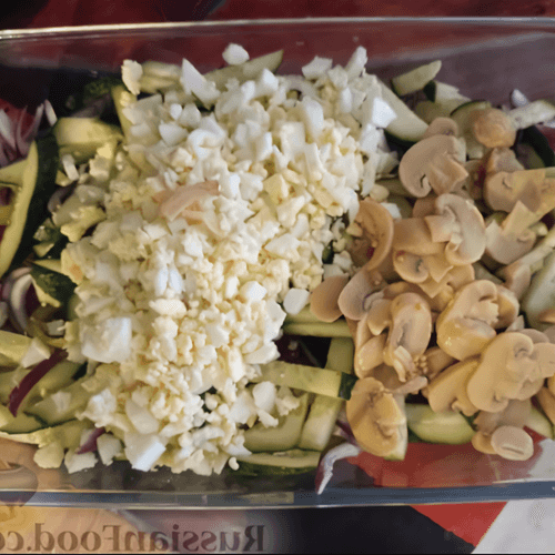 Squid salad is a refined dish of European cuisine that combines sea freshness, crunchy vegetables, and aromatic herbs. Light yet nutritious, it is perfect as an appetizer or a light dinner. Tender mini squid rings harmoniously blend with crispy cucumbers, sweet peppers, and tangy red onions, while mushrooms and eggs add richness to the flavor. Dressed with olive oil, the salad gains softness and balance, while sesame seeds provide a nutty touch. Thanks to the combination of fresh ingredients and spicy notes of garlic and dill, the dish has a rich taste and appetizing aroma. It is best served chilled to highlight its refreshing qualities and make it an excellent choice for warm summer days.