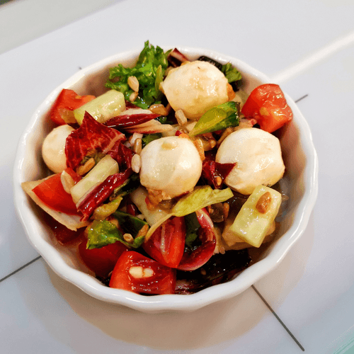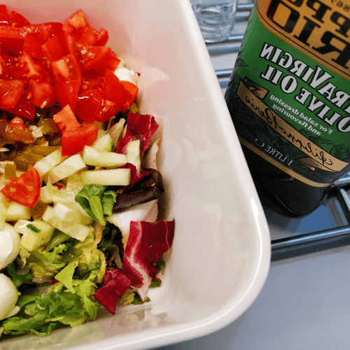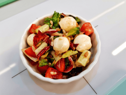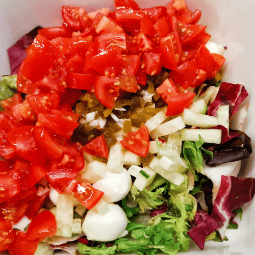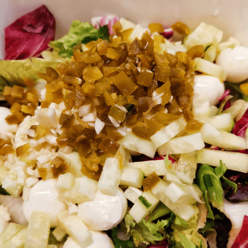 Salad with mozzarella and jalapeño pepper is a bold combination of Italian tenderness and spicy heat. Soft mozzarella balls harmoniously coexist with spicy jalapeño, while the freshness of cucumbers and tomatoes adds lightness to the dish. Crispy romaine and radicchio leaves create an exquisite backdrop, highlighting the rich flavors of the ingredients. Sunflower seeds add texture, while Himalayan salt and extra virgin olive oil reveal all shades of the flavor palette. This salad is not just an appetizer but a true gastronomic experience that awakens the senses. It is perfect for summer dinners or as an appetizing starter before the main course. Inspired by Italian cuisine, this recipe showcases the art of combining simple ingredients into an exquisite dish.