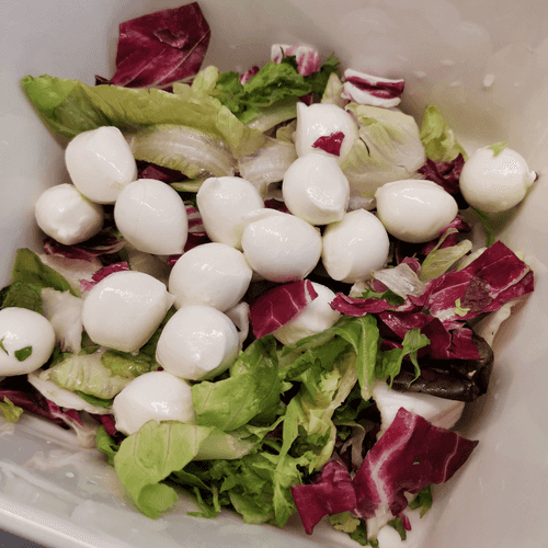 Tear the lettuce leaves by hand and combine them in a deep bowl with mozzarella balls.