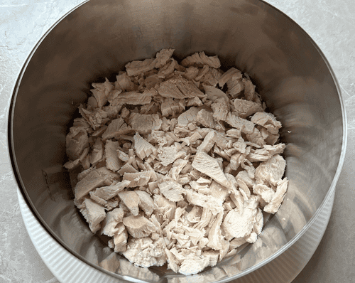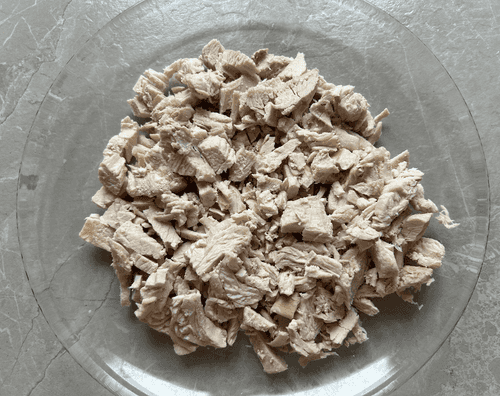 Cut the boiled chicken fillet into cubes.