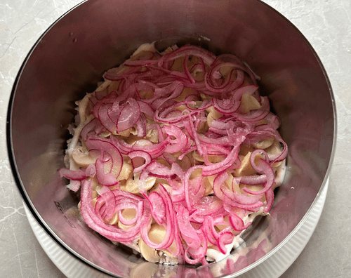 Place the marinated onions and mushrooms.
