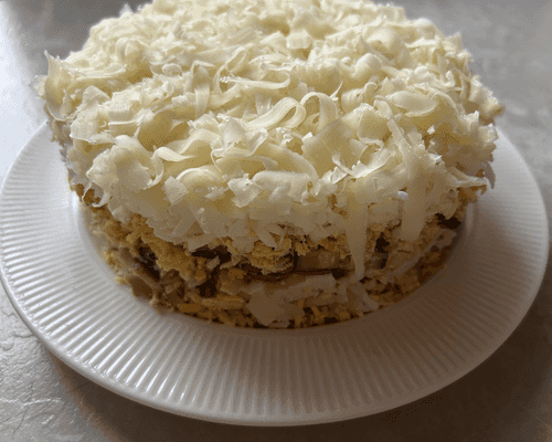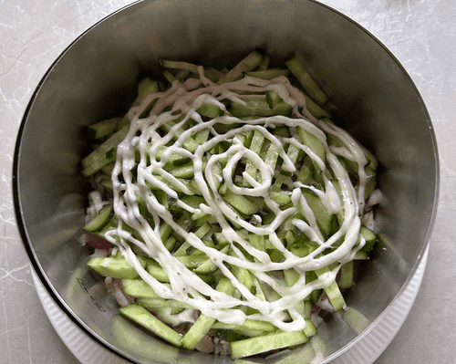 Салат с консервированными шампиньонами – это гармоничное сочетание нежного куриного филе, пикантного маринованного лука и сочных огурцов, дополненное мягкостью сыра и яиц. Этот салат пришел из русской кухни, где особое внимание уделяется насыщенным и сбалансированным вкусам. Шампиньоны придают блюду выразительную грибную нотку, а майонез объединяет все ингредиенты в единую композицию. Салат идеально подходит для праздничного стола, радуя не только вкусом, но и аппетитным видом. Его слоистая структура делает каждую вилку насыщенной и многогранной. Исторически блюда с грибами высоко ценились за свою питательность, а данный рецепт – удачное воплощение традиционных вкусов в современной интерпретации.