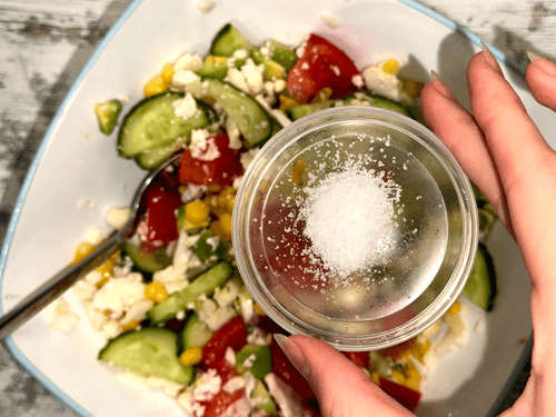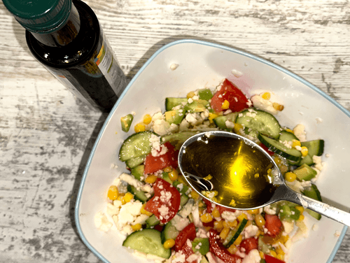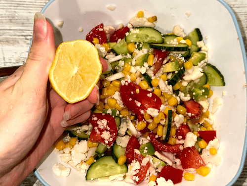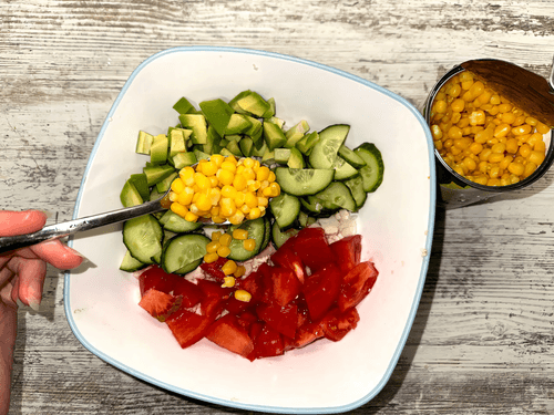 Put the vegetables in a salad bowl with cauliflower, add corn.
