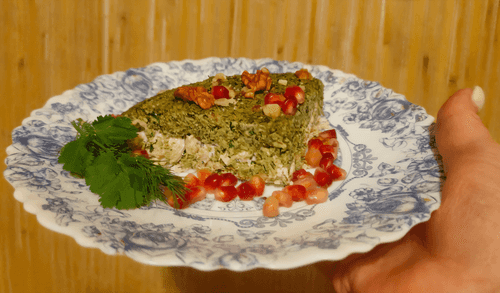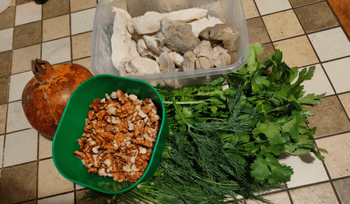 Chicken salad with walnuts and herbs topped with pomegranate is a true embodiment of Georgian cuisine, where simple ingredients transform into a rich flavor ensemble. Tender shredded chicken meat combines with nuts that add a velvety texture and light sweetness to the dish. Herbs bring freshness while pomegranate seeds provide brightness and a hint of tartness, creating an exciting contrast of flavors. Mayonnaise binds the ingredients together, highlighting their richness. This salad not only decorates the festive table but also symbolizes the hospitality and warmth of Georgian cuisine. It is served as an appetizer or light main dish, allowing one to enjoy the richness of flavors in every bite.