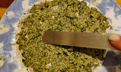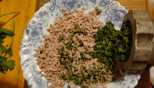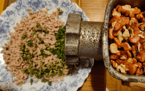 It should be a minced mixture of meat, nuts, and greens that needs to be mixed with 3-4 tablespoons of mayonnaise.