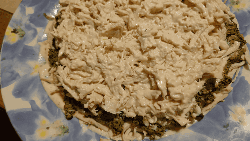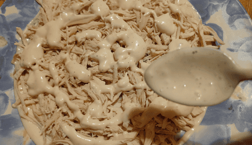 Place half of the shredded white meat and pour 2 tablespoons of mayonnaise over it.