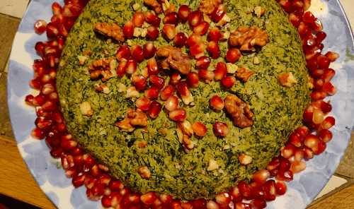 Garnish the salad with nuts and pomegranate seeds.