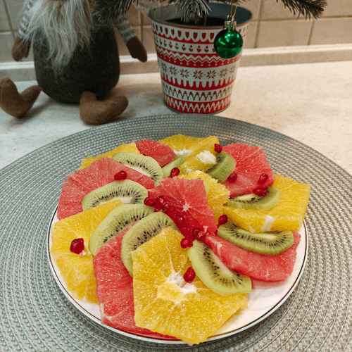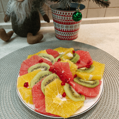 Fruit salad with vanilla syrup is a refined combination of fresh citrus and exotic fruits enriched with a sweet hint of vanilla. Its roots can be traced back to European cuisine, where fruit compositions have always symbolized lightness and sophistication. In this recipe, oranges, grapefruit, and kiwi create a rich flavor: the sweet and sour notes intertwine harmoniously, while pomegranate seeds add a slight tartness. The delicate vanilla syrup makes the salad particularly aromatic, turning it into an ideal dessert or refreshing snack. It can be served on festive tables or used as a light finish to dinner. The simplicity of preparation and exquisite taste make this salad a popular choice for lovers of natural and healthy sweets.
