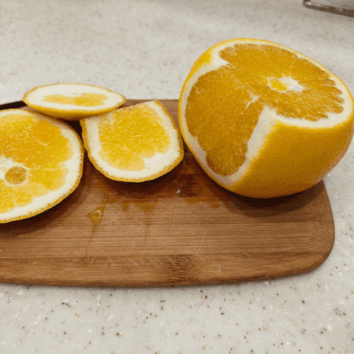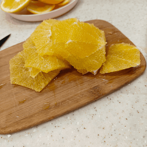 Use a sharp knife to cut the peel off both sides of the orange, slightly touching the flesh.