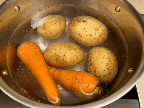 Salt the water, add spices, and boil the potatoes and carrots until cooked.