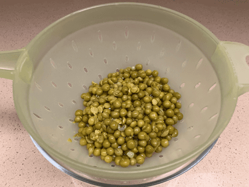 Take the green peas out of the can and drain the water.