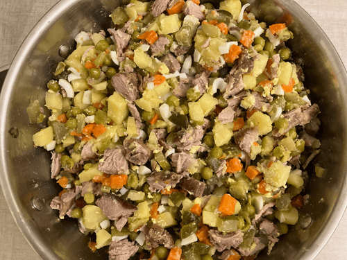 Olivier with Worcestershire sauce is an original take on the classic Russian salad, combining traditional ingredients with a spicy note of English sauce. This recipe adds new depth to the familiar taste with marinated turkey infused with spices and Worcestershire sauce. The tenderness of quail eggs harmonizes with crunchy pickles and the softness of potatoes and carrots. This salad is not just a festive dish but a true gastronomic story that blends tradition and experimentation. Dressed with mayonnaise, Olivier gains a rich texture while Worcestershire sauce adds delicate spiciness, making each bite flavorful.