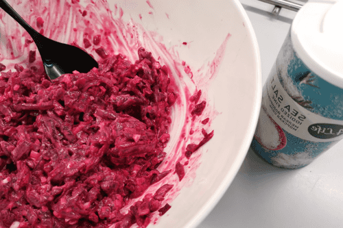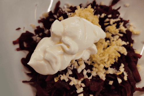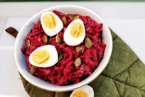 Beetroot-garlic salad is a bright and aromatic dish of Russian cuisine that embodies simplicity and richness of flavor. Its history traces back to traditional rural recipes where accessible ingredients were transformed into true culinary masterpieces. Tender boiled beetroot adds a sweet note that harmoniously complements the spiciness of fresh garlic. Mayonnaise binds all components together, making the salad's texture delicate and creamy. Quail eggs add softness, while pumpkin seeds provide a light crunch and nutty flavor. This dish is perfect as an independent appetizer or a side dish for meat and fish dishes. The beetroot-garlic salad not only delights with its rich taste but also offers health benefits due to its high content of vitamins and minerals.