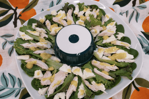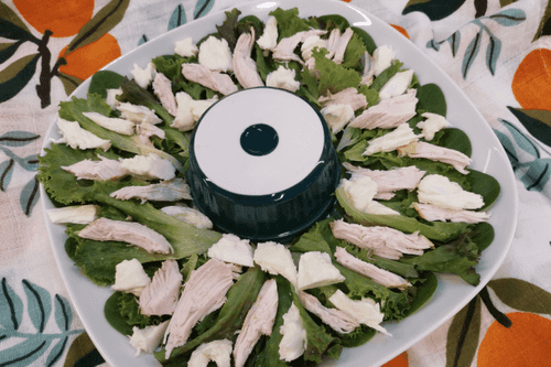 Place the chicken in the salad.