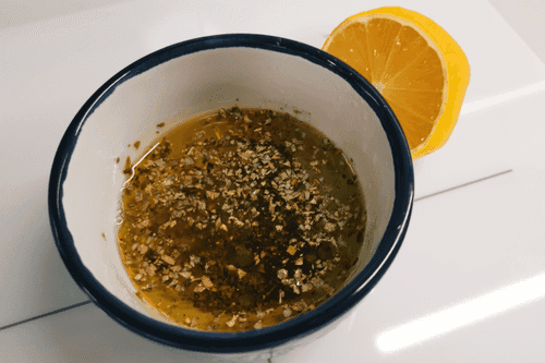 For the sauce, mix oil, lemon juice, oregano, salt, and black pepper.