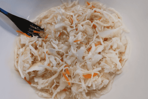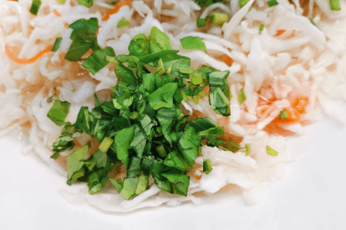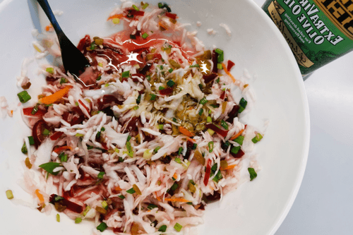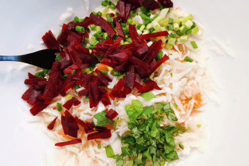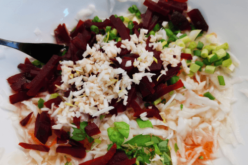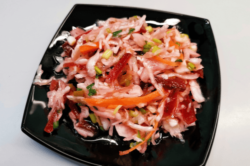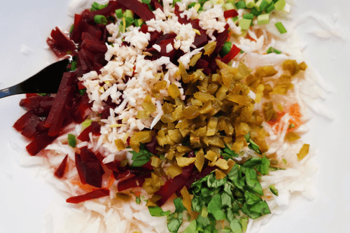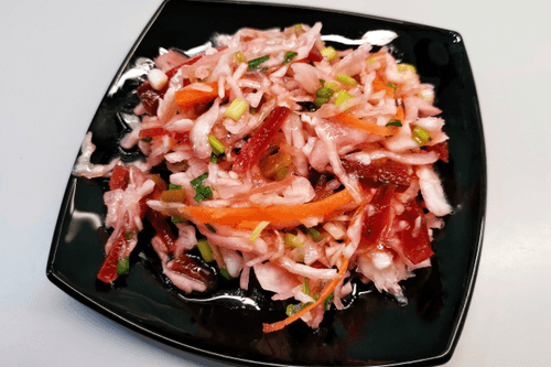 The salad of fermented cabbage with beetroot and jalapeño is a vibrant and spicy dish rooted in Russian culinary traditions. It combines the rich tang of fermented cabbage, the sweetness of beetroot, and the heat of jalapeño, creating a harmony of flavors that refreshes and stimulates the appetite. Olive oil adds smoothness, while garlic and herbs provide aromatic depth. This salad not only delights the palate but also offers health benefits due to the probiotic properties of cabbage and antioxidants in beetroot. It pairs well with meat dishes or serves as a standalone vitamin-rich snack for those who appreciate bold flavors and healthy eating.