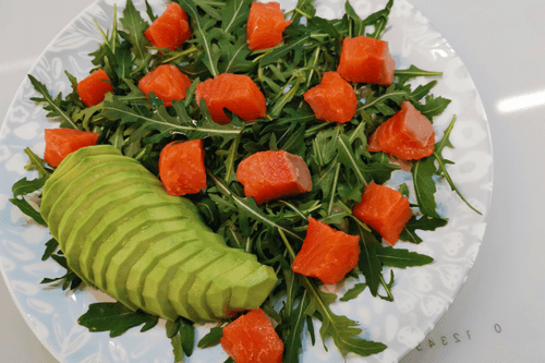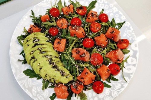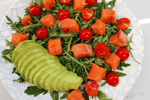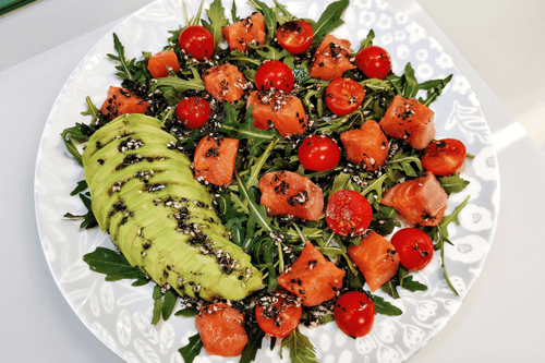 Salad with lightly salted salmon is a true embodiment of Mediterranean elegance. Its delicate flavor unfolds through the harmonious combination of arugula, creamy avocado, and juicy cherry tomatoes, while salmon cubes add a noble saltiness. The origins of this dish trace back to Mediterranean cuisine, where freshness and simplicity of ingredients are valued. Light wine vinegar combined with olive oil highlights the subtlety of flavors, while sesame and basil add spicy accents. This salad not only delights with its gastronomic balance but also serves as an excellent option for a light dinner or an exquisite appetizer on a festive table.