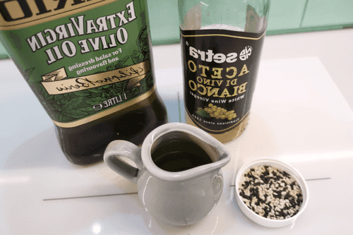 Mix oil and wine vinegar in a sauce bowl. Add sesame.