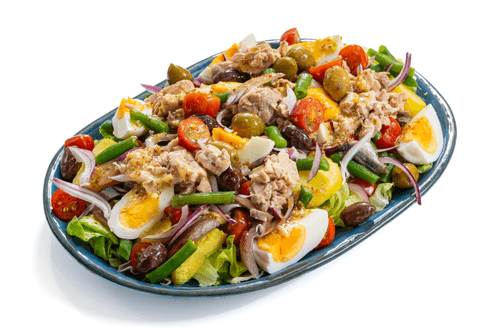 Garnish the salad with cod liver and olives and serve.