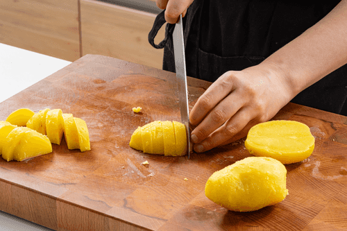 Boil the potatoes in their skins, peel them, and cut into large slices.