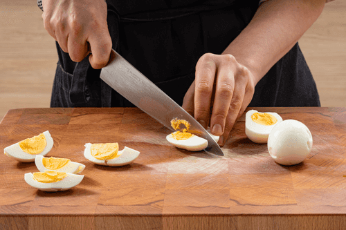 Boil the eggs hard, cool them in cold water, and cut into wedges.