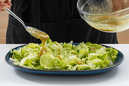 Sprinkle the prepared dressing over the salad leaves.