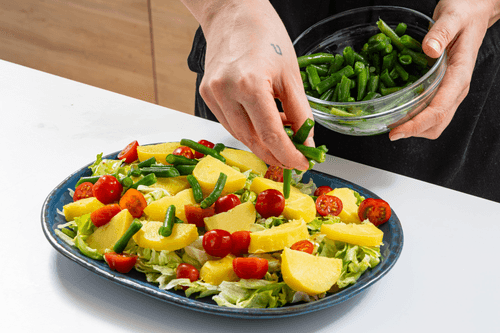 Cut the tomatoes in half and place them in a bowl with potatoes and beans, then drizzle with dressing.