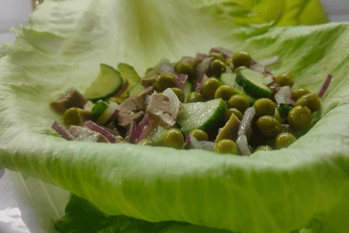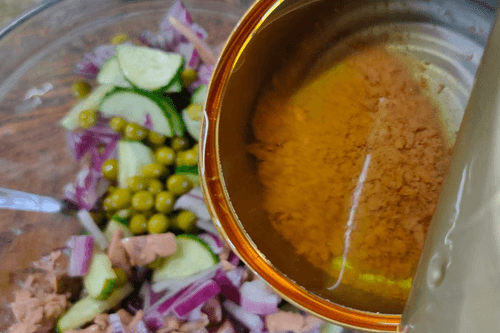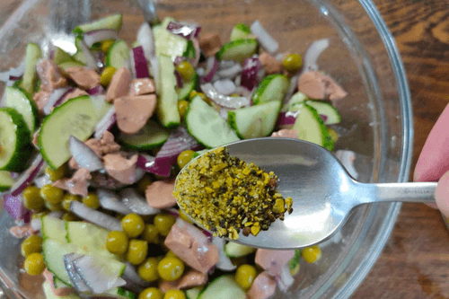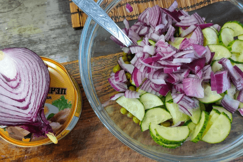 Cod liver salad with green peas, onions and cucumber