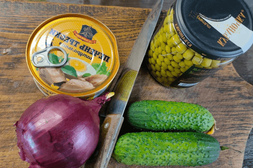 Salad made of cod liver with green peas, onion, and cucumber is a classic Russian dish known for its rich flavor and delicate texture. Cod liver, famous for its health benefits, adds creaminess and richness to the salad, while fresh cucumbers and green peas provide juiciness and lightness. Red onion adds a spicy note, and black pepper with lemon zest brings a subtle spicy freshness. Dressed with natural fish oil, this salad has a soft structure and harmonious flavor combination. It is perfect as an appetizer for festive tables or a light dinner, especially when paired with crispy bread. The simplicity of preparation makes it accessible even for beginners, while its nutritional properties make it an excellent choice for balanced nutrition.