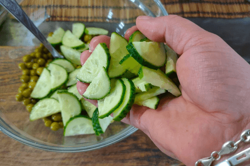 Put the sliced cucumbers in the bowl with the peas.