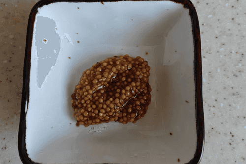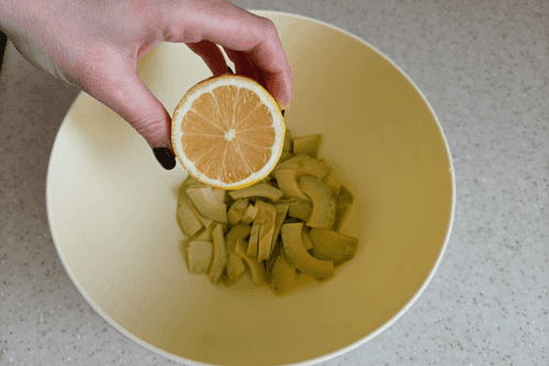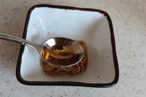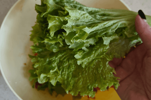 Wash the salad and tear it randomly. Add the dressing and mix all the ingredients.
