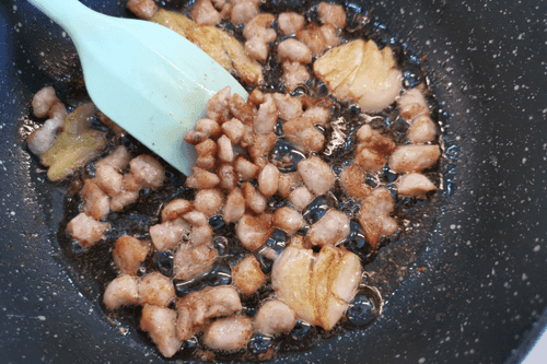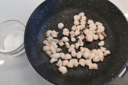 Place the skin with fat on a heated pan and salt with coarse salt. Fry on high heat for 2 minutes.