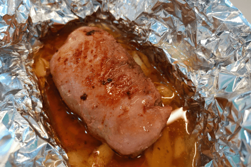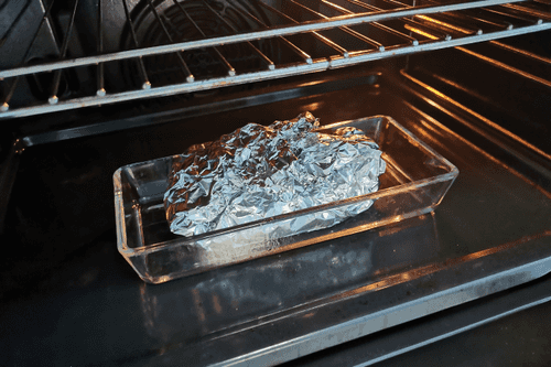 Place the chicken breast with melted fat and garlic in a baking dish lined with foil.