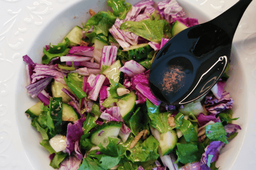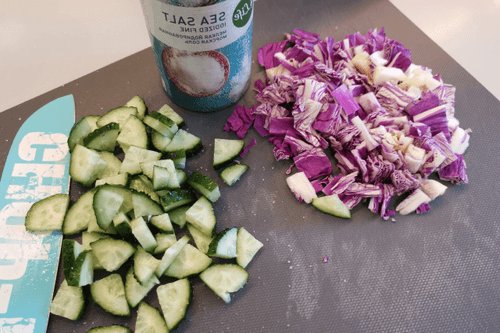 Chop the cabbage and cucumbers coarsely. Add salt.