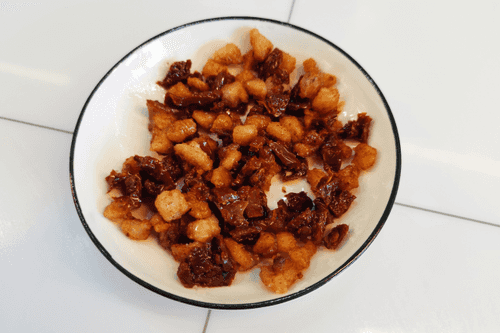 Finely chop the sun-dried tomatoes and add them to the cracklings.