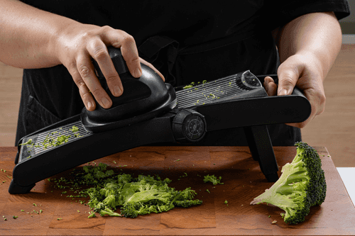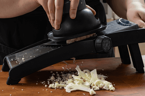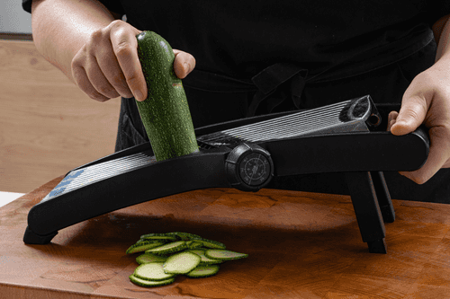Use a mandoline and knife to slice the zucchini into thin rings.