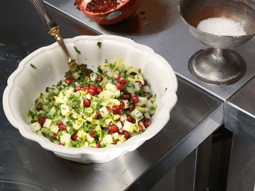 This salad is the embodiment of freshness and vibrant flavors. Crunchy celery, rich parsley greens, and sweet ruby pomegranate seeds create a perfect combination of textures and aromas. Dressed with lemon juice and olive oil, it gains a zesty lightness, while ground black pepper adds a refined spiciness. Originating from Russian cuisine yet carrying hints of Scandinavian traditions where fresh and simple ingredients are highly valued, this salad is perfect as a standalone dish for a light dinner or as a side to cold roast beef or sausage. It is not just food but a true table decoration that brings joy to everyone who tries it.