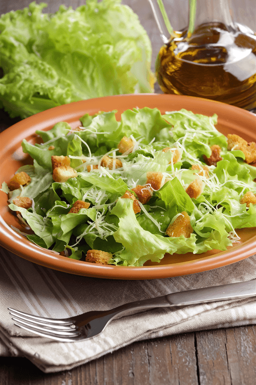 Cut or tear well-washed and dried lettuce leaves by hand, and place them at the bottom of the bowl. Drizzle with the remaining oil, and season with salt and pepper.