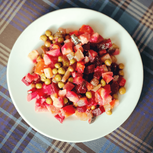 Vinaigrette with pickled cucumber is a classic dish of Russian cuisine, known for its refreshing sweet-and-sour notes and rich vegetable flavor. Its history dates back to the 19th century when salads with pickled ingredients became popular among various social classes. In this version of the traditional vinaigrette, the pickled cucumber plays a key role by adding zest and pleasant crunch to the dish. The combination of beets, potatoes, carrots, and onions creates a harmony of sweet and earthy tones, while the balsamic dressing adds a refined tanginess. Vinaigrette works well as a standalone dish or side and pairs perfectly with meat and fish dishes. It is often prepared for festive gatherings and cozy family dinners as it is not only tasty but also nutritious.
