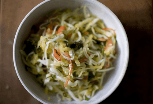 Heat the pan (without oil), toast the raw sunflower seeds, stirring quickly for about 20 seconds. Immediately add to the bowl with cabbage and mix.