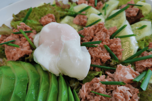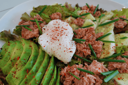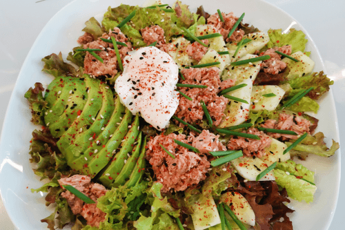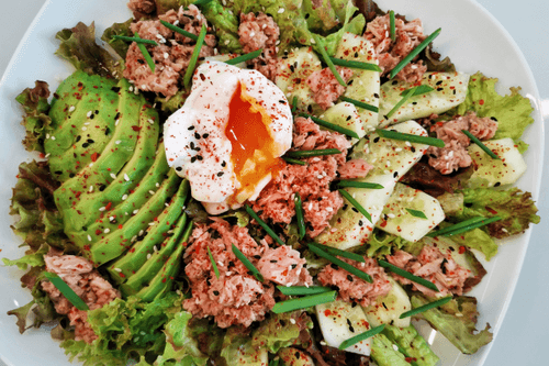 Tuna and avocado salad is an elegant combination of freshness and nutrition. This recipe, inspired by Mediterranean motifs, combines tender leafy greens, creamy avocado, and savory tuna. The light tang of apple cider vinegar enhances the depth of flavor, while the poached egg adds softness. Crunchy pieces of cucumber and green onion refresh the dish, and spicy chili flakes provide a subtle heat. Topped with sesame seeds, this salad is not only delicious but also aesthetically pleasing. It makes a great light lunch or exquisite appetizer, and its simplicity and balance make it a versatile choice for health food lovers.