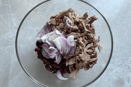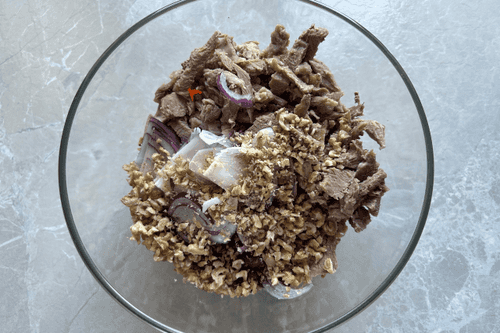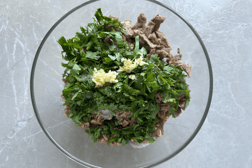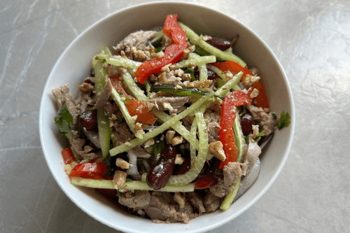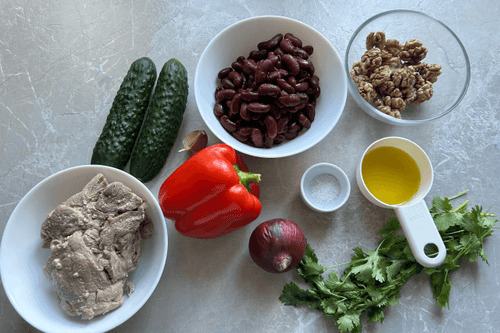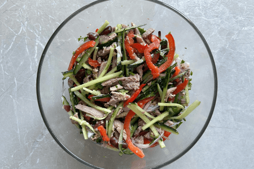 Salad with boiled beef and hot oil is a harmony of flavors and textures that reflects the richness of Russian cuisine. Tender, juicy beef, the refreshing crunch of cucumbers, aromatic bell peppers, and the richness of beans create a unique ensemble. The addition of walnuts gives the dish a noble nutty note, while herbs and garlic enhance freshness. But the main thing is the hot oil that infuses the ingredients and reveals their flavor, making the salad particularly rich and deep. This dish is not just an appetizer but a true gastronomic ritual that warms the soul and delights the taste buds. It is perfect for both festive tables and cozy dinners, allowing one to enjoy traditional yet original combinations of products.