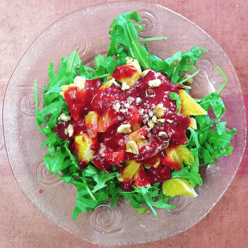 Salad with orange and arugula with cranberry dressing is a harmony of freshness and vibrant flavors born at the crossroads of European culinary traditions. Crunchy arugula with nutty notes, sweet oranges, and tangy cranberry dressing create a balance of flavors that captivates from the first bite. The dressing made from fresh cranberries, garlic, and dates adds a velvety sweet-sour depth to the sauce, while apple cider vinegar and olive oil enrich the aroma. This salad will be an exquisite addition to a festive table or a light refreshing snack. Perfect as a standalone dish or as a side to delicate meat or fish dishes.